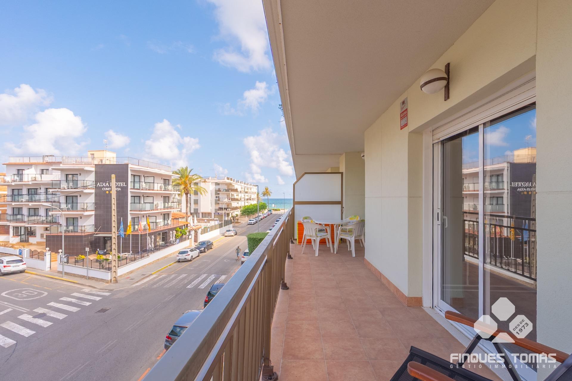 Presentamos este exclusivo piso de tres dormitorios en primera línea de playa en Cunit, con vistas laterales al mar y una excelente orientación que le aporta mucha luz natural durante todo el día. Una propiedad que destaca por su confort, funcionalidad y ubicación privilegiada, ideal para familias que desean disfrutar del entorno mediterráneo.~~Ubicada en una finca del 1997, la vivienda cuenta con una superfície construida de 76 m² y una distribución muy bien aprovechada. Al entrar, un elegante recibidor da paso al amplio y luminoso salón comedor con acceso directo a la terraza con vistas laterales al mar, perfecta para comer al aire libre o disfrutar de la brisa marina y el clima mediterráneo. La cocina independiente está completamente equipada, bien distribuida y diseñada para aprovechar al máximo el espacio. La zona de noche consta de tres dormitorios; dos dobles muy amplios con armarios empotrados y uno individual, ideal para crear un despacho, vestidor o habitación infantil. El dormitorio principal es en suite, con baño privado con bañera. La vivienda dispone de un segundo baño completo con bañera para mayor comodidad.~~El piso se encuentra en una primera planta de un edificio con ascensor y ofrece vistas al mar ya desde la propia planta. Incluye también plaza de parking exterior cubierta y trastero, comodidades imprescindibles en la zona. Situado en una zona privilegiada con acceso directo al paseo marítimo, este piso ofrece tranquilidad, buena comunicación y cercanía a todos los servicios –farmacias, supermercados, comercios y restauración–.~~Una joya inmobiliaria en una de las zonas más solicitadas de la localidad, perfecta como primera o segunda residencia. Contáctanos para más información o para realizar una visita privada.~